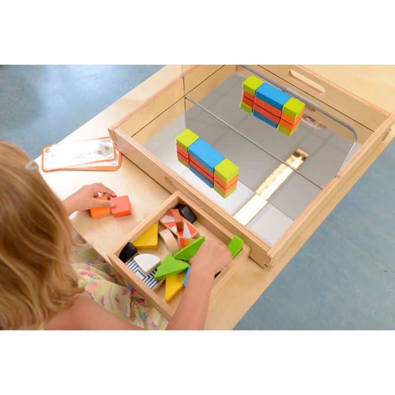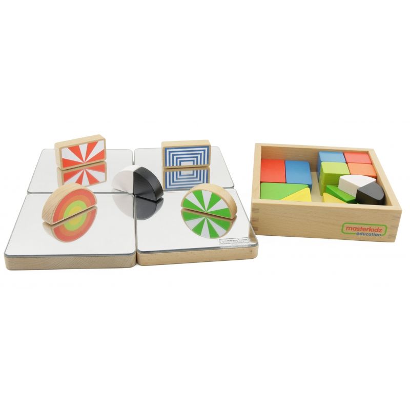 Dzięki klockom Wzory i kolory szkrab zbuduje niezwykłe budowle – wieże, zamki i domki! Zestaw zawiera 24 bajecznie kolorowe klocki. Część z nich jest ozdobiona ślicznymi wzorami, które z pewnością wzbudzą zainteresowanie dziecka. Wszystkie elementy są wykonane z wytrzymałego drewna. Zestaw świetnie sprawdza się w połączeniu z zabawkami lustrzanymi Masterkidz.