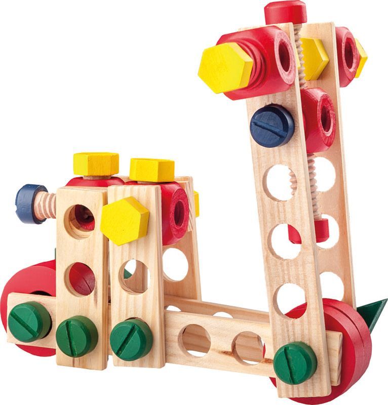 Zestaw składa się z następujących elementów: podłużnych klocków, rombów z gwintem, kostek, śrubek, podkładek, nakrętek, tulejek, kół, drewnianego klucza i śrubokręta. Całość zapakowano w poręczne wiaderko, które ułatwi przechowywanie wszystkich części w jednym miejscu. Zestaw świetnie sprawdzi się jako prezent!