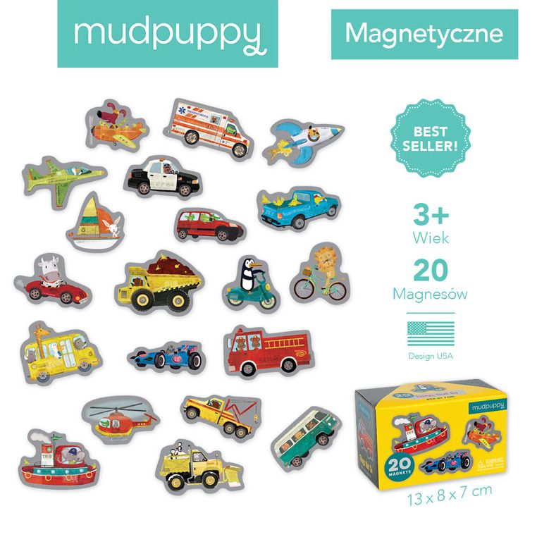 Zestaw magnesów Środki transportu to oryginalny pomysł na upominek dla dziecka, które uwielbia podróże w wyobraźni. W pudełku szkrab znajdzie 20 ślicznych magnesów przedstawiających najróżniejsze środki transportu. Pojazdy prowadzą dzielne zwierzątka, którym niestraszna żadna przeszkoda na drodze! Magnesy można umieszczać na wybranych magnetycznych lub metalowych powierzchniach.
