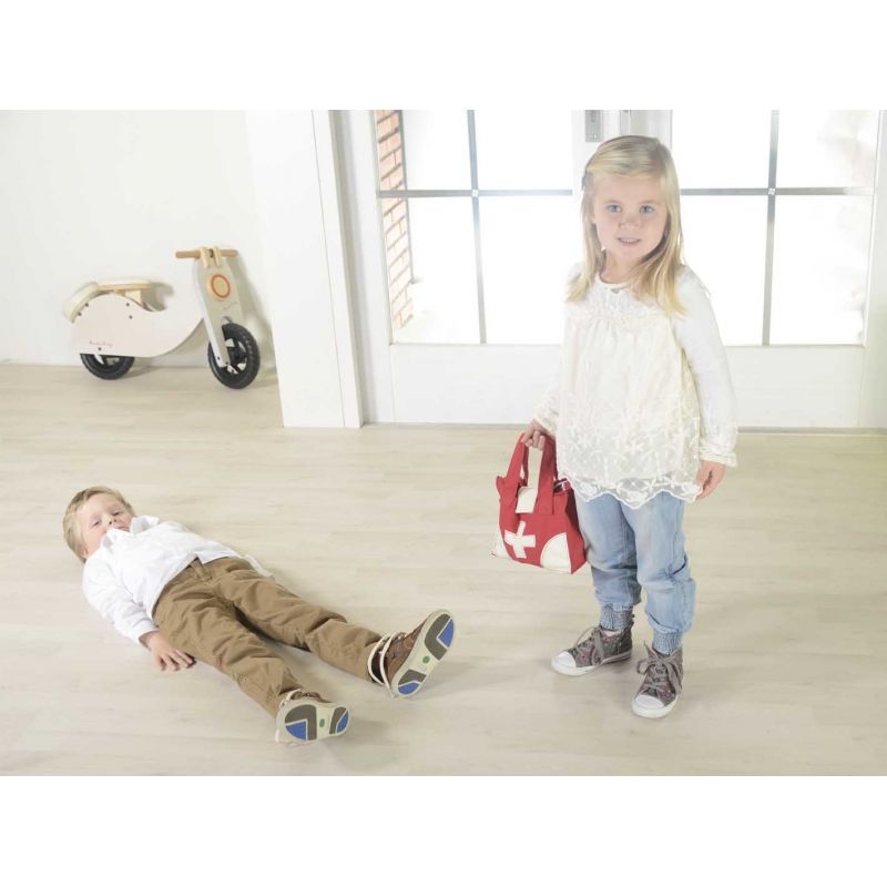 Dzięki zestawowi przyrządów lekarskich dziecko będzie mogło wcielić się w rolę doktora, co bez wątpienia sprawi mu mnóstwo frajdy. Zestaw zawiera wiele starannie wykonanych, drewnianych akcesoriów, m.in. stetoskop, strzykawkę, telefon komórkowy, termometr, młoteczek neurologiczny i lekarstwa. Wszystkie elementy zapakowano w estetyczną torbę, którą brzdąc może nosić ze sobą podczas wizyt u pacjentów.