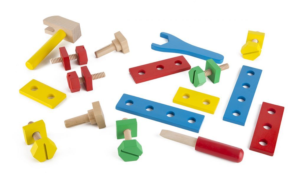 Wszystkie elementy wykonano z drewna dzięki czemu zabawa będzie bezpieczna. Zestaw charakteryzuje wysoka jakość wykonania, jest on bardzo trwały. Zabawa w majsterkowicza powoli dziecku rozwijać koordynację ręka-oko oraz kształtować twórcze myślenie.