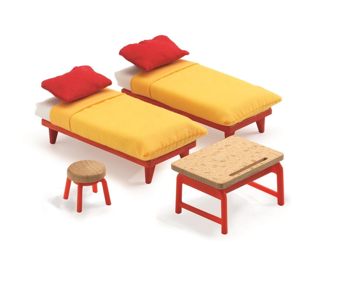 Meble do sypialni dzieci to niezbędny dodatek do każdego domku dla lalek. Zestaw zawiera dwa pojedyncze łózka wyposażone w materac i poduszkę, a także taboret oraz stolik. Komplet należy do kolekcji Petite Home, która została zainspirowana nowoczesnymi trendami w architekturze.