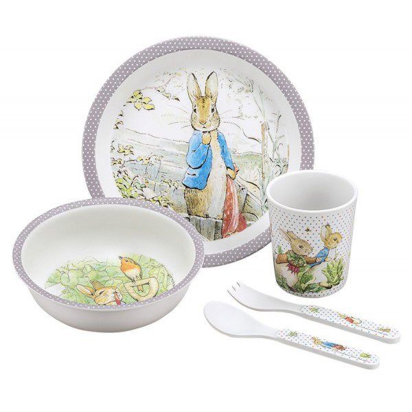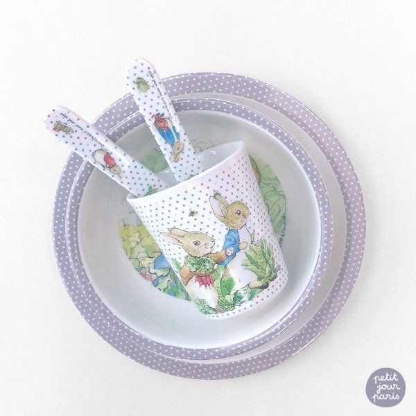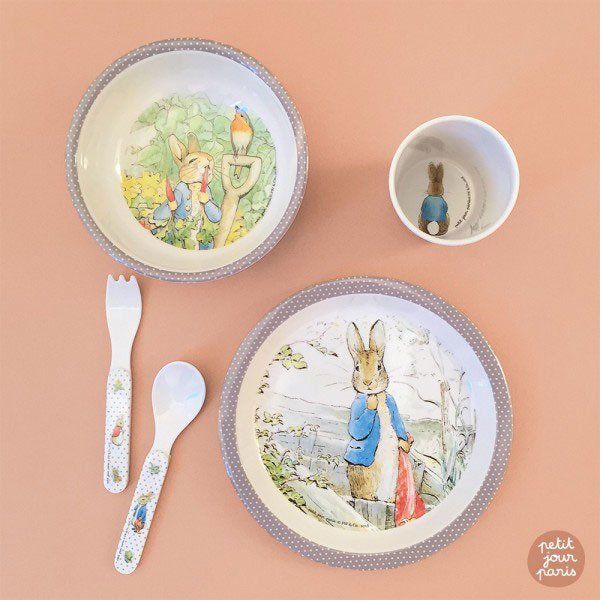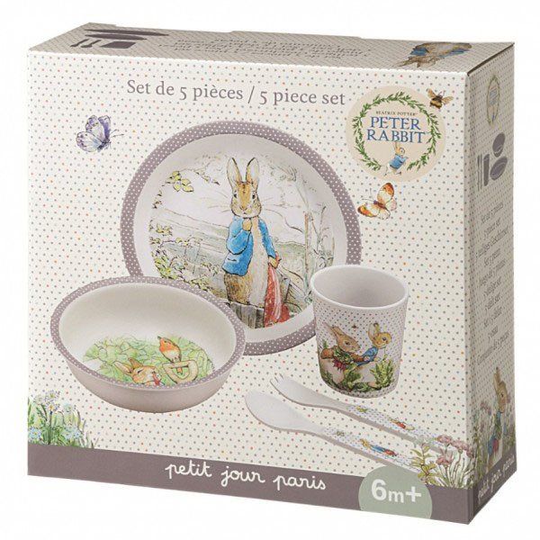 Zestaw naczyń i sztućców dla dziecka 5 elementów Królik Piotruś Petit Jour Paris 6 msc+