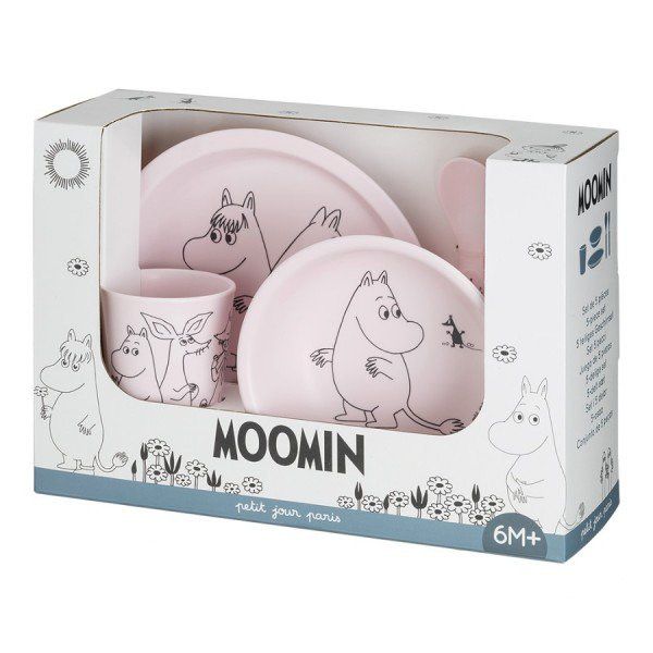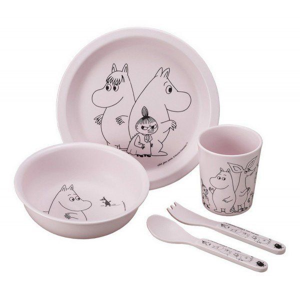 Zestaw naczyń i sztućców – Muminki to komplet zastawy stołowej dla najmłodszych dzieci. W skład zestawu wchodzi: miseczka, talerzyk, łyżeczka, widelczyk, kubek. Naczynia i sztućce są różowe, przyciągające uwagę. Do tego znajdziemy na nich obrazki z postaciami z popularnej bajki.