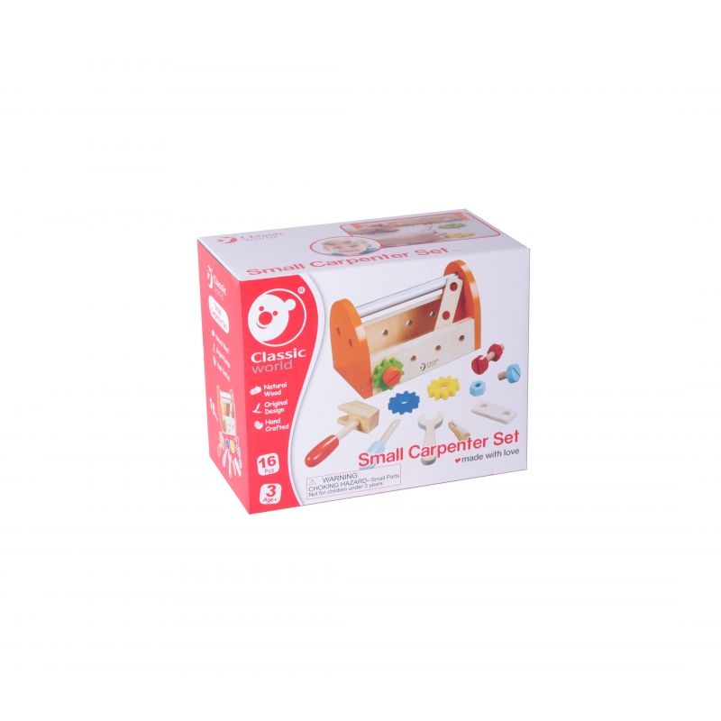 Zabawki firmy Classic World cechuje bardzo wysoka jakość wykonania. Są wykonane z najwyższą starannością z trwałych i ekologicznych materiałów i pomalowane bezpieczną dla dzieci farbą. W drewnianej skrzynce z rączką znajduje się wiele akcesoriów. Między innymi: młotek, klucz, śrubokręt czy śrubki. Wyjątkowa forma zabawki zapewni doskonałą rozrywkę maluchom!
