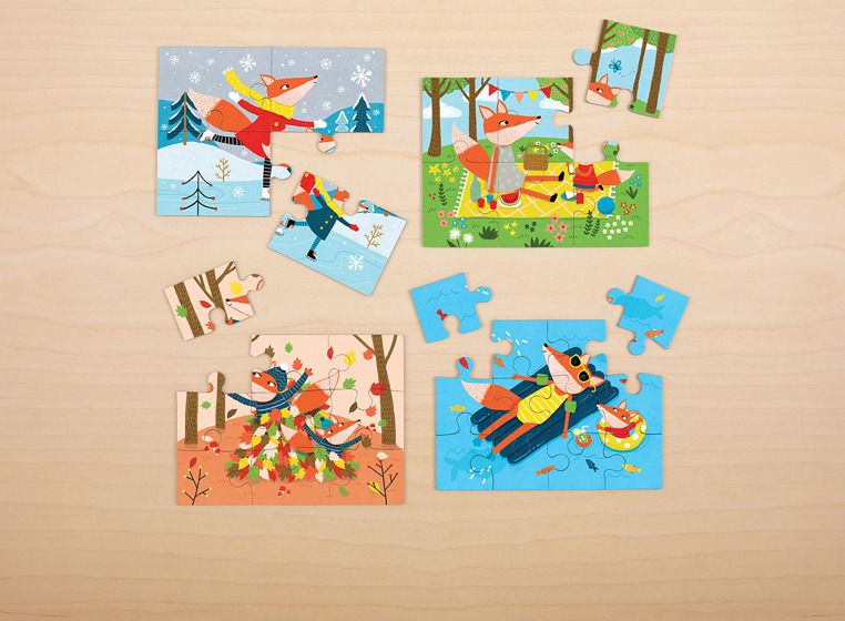 Zestaw puzzli 4w1 Pory roku umożliwia maluchowi ułożenie czterech układanek o wymiarach 15 x 20 cm, które składają się z 4, 6, 9 i 12 elementów. Na obrazkach można podziwiać sympatyczne liski oddające się sezonowym przyjemnościom – jeździe na łyżwach, piknikowaniu, zabawie wśród liści oraz letniej kąpieli. Zestaw Pory roku doskonale sprawdzi się jako pierwsze puzzle dziecka. Szkrab może rozpocząć zabawę od ułożenia czteroelementowego obrazka, a później przejść do układanek z większą liczbą elementów.