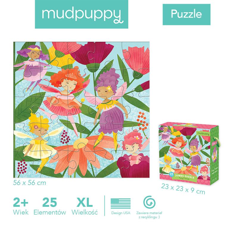 Jeśli Twoje dziecko fascynują magiczne istoty, puzzle Wróżki podbiją jego serce! W opakowaniu znajduje się 25 bardzo dużych, poręcznych dla malucha elementów, które tworzą kolorowy obrazek przedstawiający pięć wróżek. Obrazek ma wymiary 56 x 56 cm i wspaniale się prezentuje. Autorką projektu jest amerykańska artystka, Stephanie Fizer Coleman.