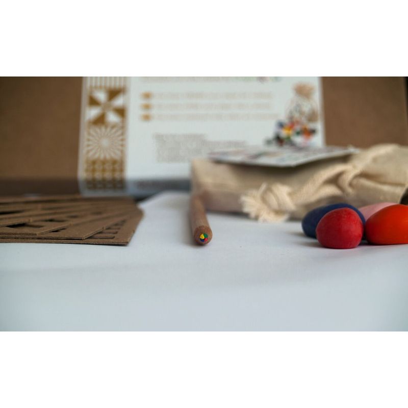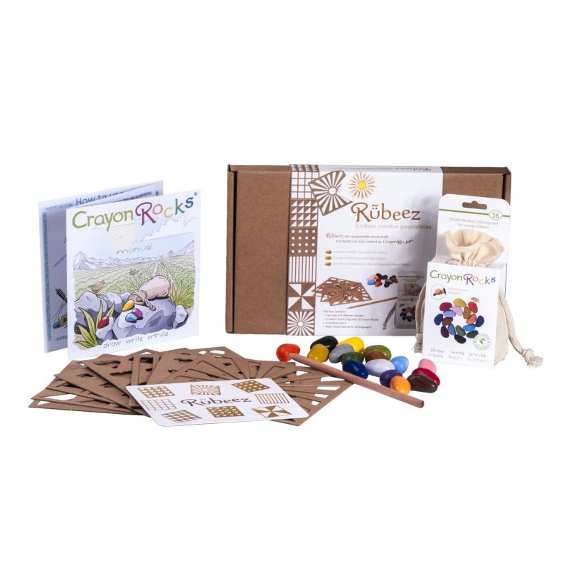 W zestawie znajduje się 16 kolorowych kredek o oryginalnym kształcie, przypominającym kamyki. Dołączony jest także tęczowy ołówek oraz aż 8 szablonów do projektowania rysunków. Jeżeli dziecku wyczerpią się pomysły, może zajrzeć do znajdującej się w zestawie książeczki z pomysłami jak wykorzystać zestaw Rubeez.