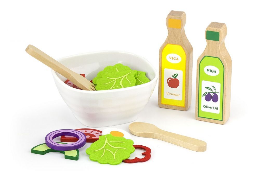 Zestaw sałatkowy – zrób sałatkę zawiera wszystko, co jest potrzebne do skomponowania przepysznej sałatki. W jego skład wchodzi miseczka, drewniany widelec, łyżka do mieszania, elementy filcowe: 3 plasterki papryki i 6 listków sałaty, elementy drewniane: 21 plasterków różnych warzyw i jajka, oliwa i sos winegret oraz menu z czterema przykładowymi sałatkami. Tak bogaty zestaw daje wiele możliwości zabawy – dziecko może odwzorowywać sałatkę z menu lub przygotować własną, autorską kompozycję. Zabawa w przyrządzanie sałatki zachęci maluchy do zdrowej żywności, a przestrzeganie przepisu to doskonała nauka dokładności, która może się przydać podczas sporządzania prawdziwych posiłków.