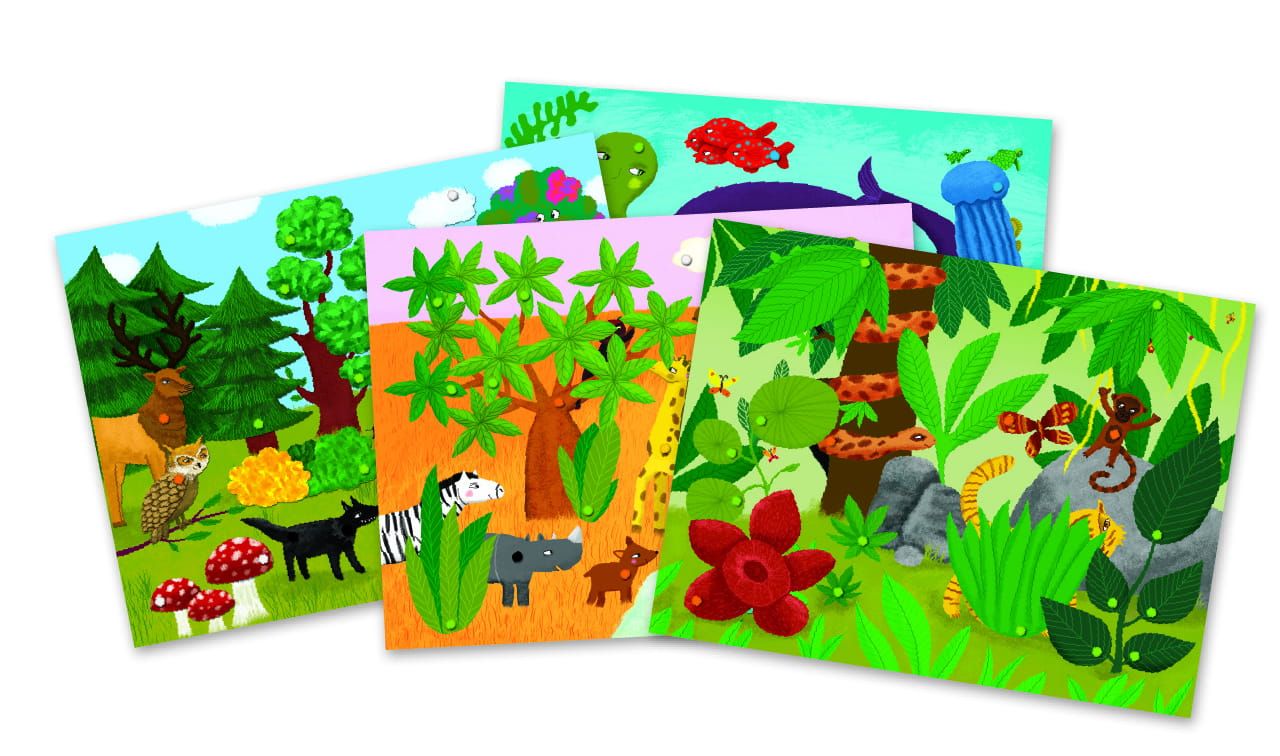 – plansze z otworami przedstawiające 4 różne środowiska,w którym żyją zwierzęta,