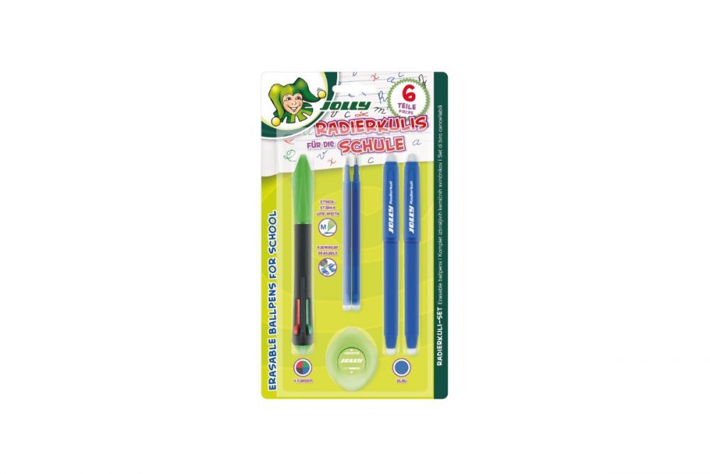 Do zestawu dołączono również gumkę, którą można zmazywać zarówno ołówek, jak i długopis; 2 zmazywalne niebieskie długopisy z funkcją zmazywania oraz 2 niebieskie wkłady na zmianę.