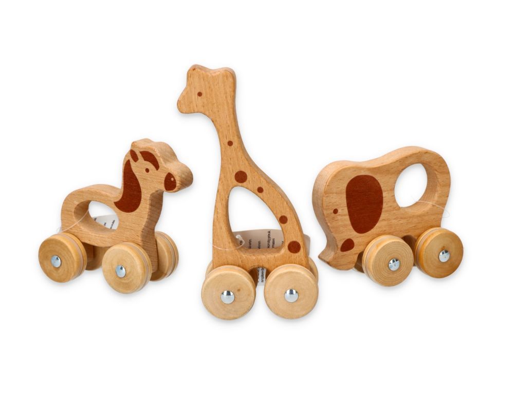 Zabawki mają formę ślicznych zwierzaków na kółkach. W środku mają otwory, które dodatkowo ułatwiają manipulacje nią. Do wyboru są pojazdy w trzech kształtach:
